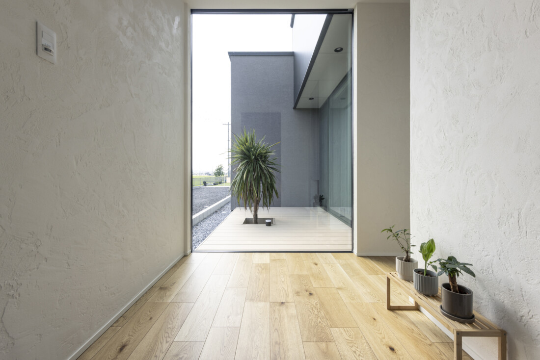 玄関ホールからも中庭が眺められるよう大きな窓をレイアウトしました。
