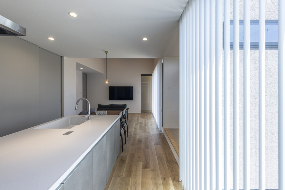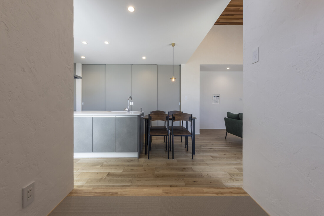 畳スペースから見るダイニングの景色も、グレーの建具ですっきりとまとめたキッチン収納が美しく見えるようデザイン。リビングの高天井へと視線が抜けるデザインも、チェックハウスならではです。