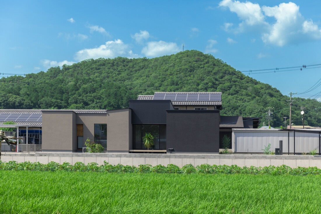 美しい山や緑の景色に調和するようなデザインの平屋は、外構の色味もブラックだけでなくグレーやベージュを採用。