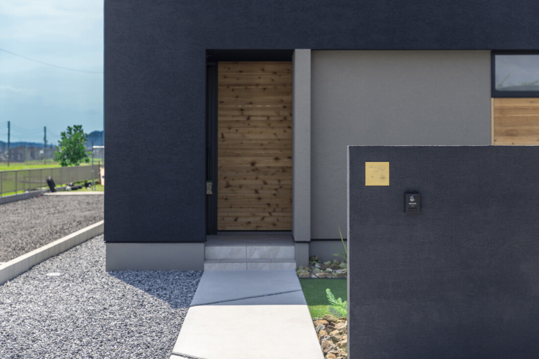 玄関周りには木材を使用するなど、素材と色の変化によって直線的なラインをさらに引き立てています。