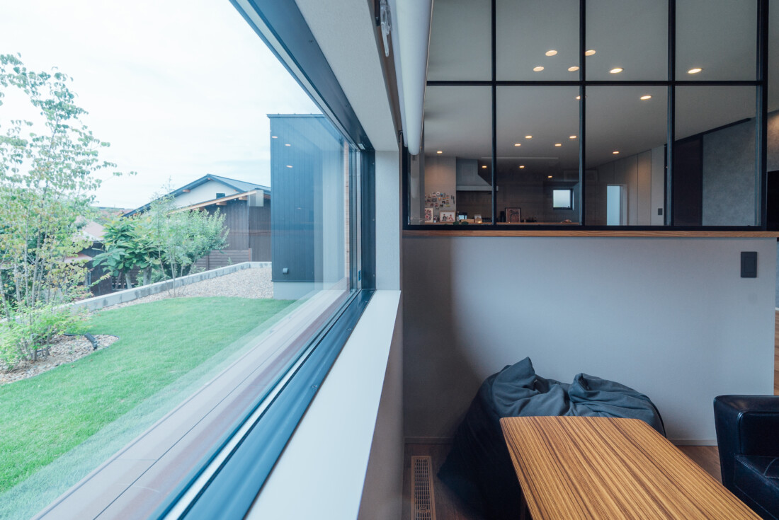 大きな庭に面したリビングの隣には、ガラスの内窓でゆるやかにつながるライブラリーコーナーを設けました。