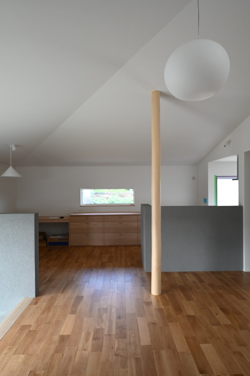 勾配天井による開放感あふれるLDK、家の中心に配置したウォークインクローゼットを軸にした回遊動線(ぐるぐる動線)、そして塗り壁と深い軒が生み出す上質な陰影が印象的な住まいです。