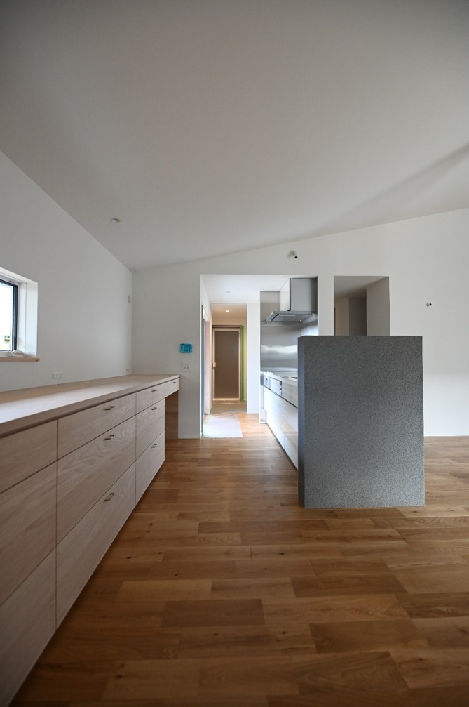さらにキッチンカウンターにも同素材を使い、空間全体に統一感を持たせました。