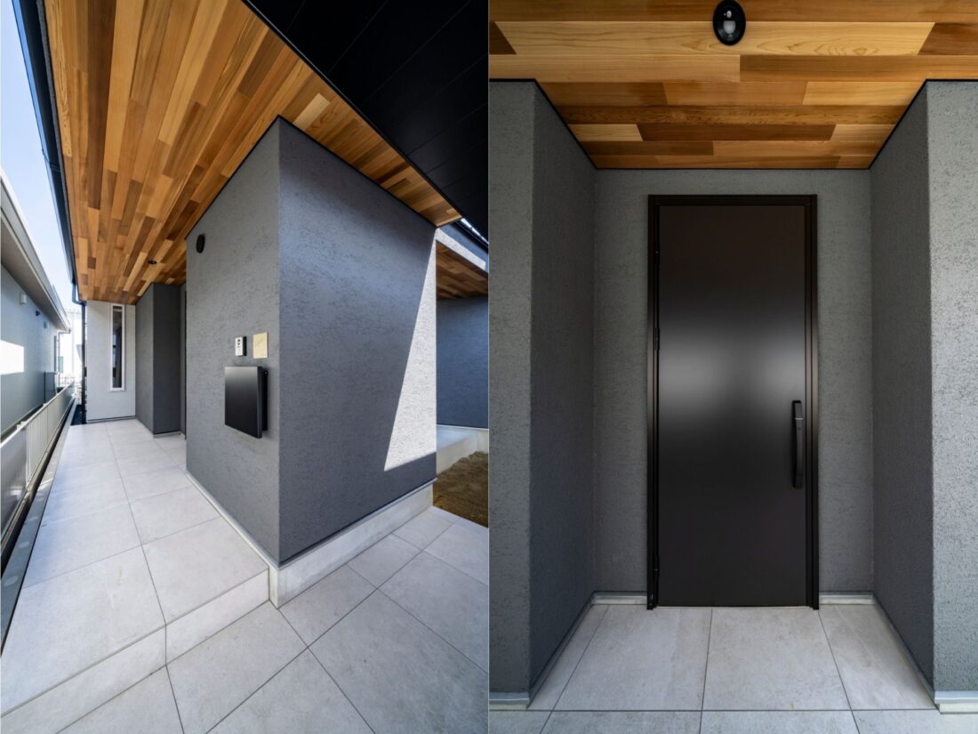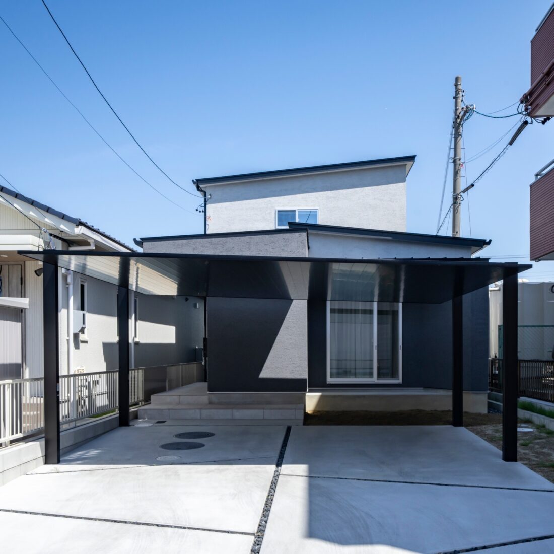 外観は、落ち着いたブラックとグレーを基調としたシックな佇まい。駐車スペースのカーポートと一体になるようデザインすることで、雨の日でも濡れずに玄関へアクセスできる動線を確保しています。深くかけた軒と、木目の軒天がもたらす陰影が、シンプルな外観に高級感を添えています。