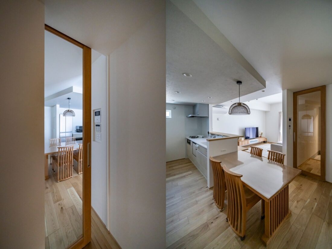 さらに玄関ホールからLDKへとつながる建具にはガラス戸を採用。玄関ドアを開けた際に室内が丸見えにならないようレイアウトされているため、プライバシーを守りながら、室内のやわらかな灯りが玄関へと漏れる演出が生まれています。