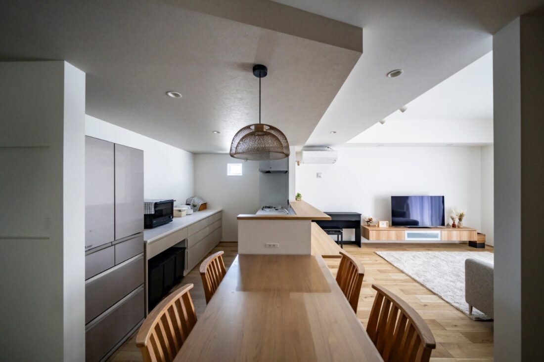 キッチンカウンターは、あえて木材を薄くデザイン。重くなりがちな対面キッチンに軽やかさを持たせ、LDK全体をすっきり見せています。