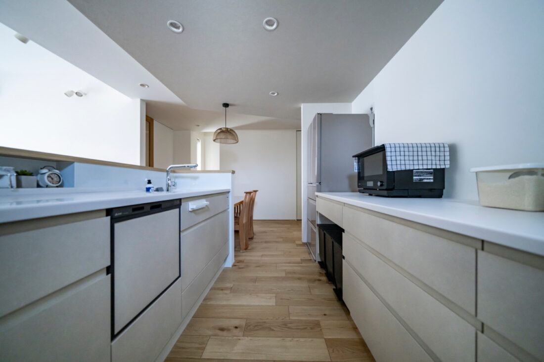 キッチンの天井のみ、他の天井(白)よりワントーン暗いグレーを採用。空間にメリハリが生まれ、天井高の変化をより印象的に感じられる住空間が実現しました。