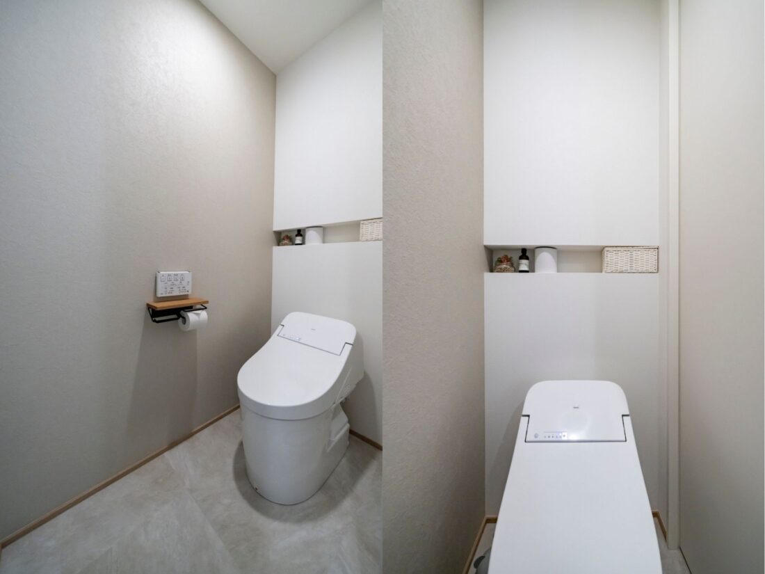 トイレには、トイレットペーパーの高さに合わせたニッチ収納を設置。実用性とデザイン性を両立した、スタイリッシュな空間です。