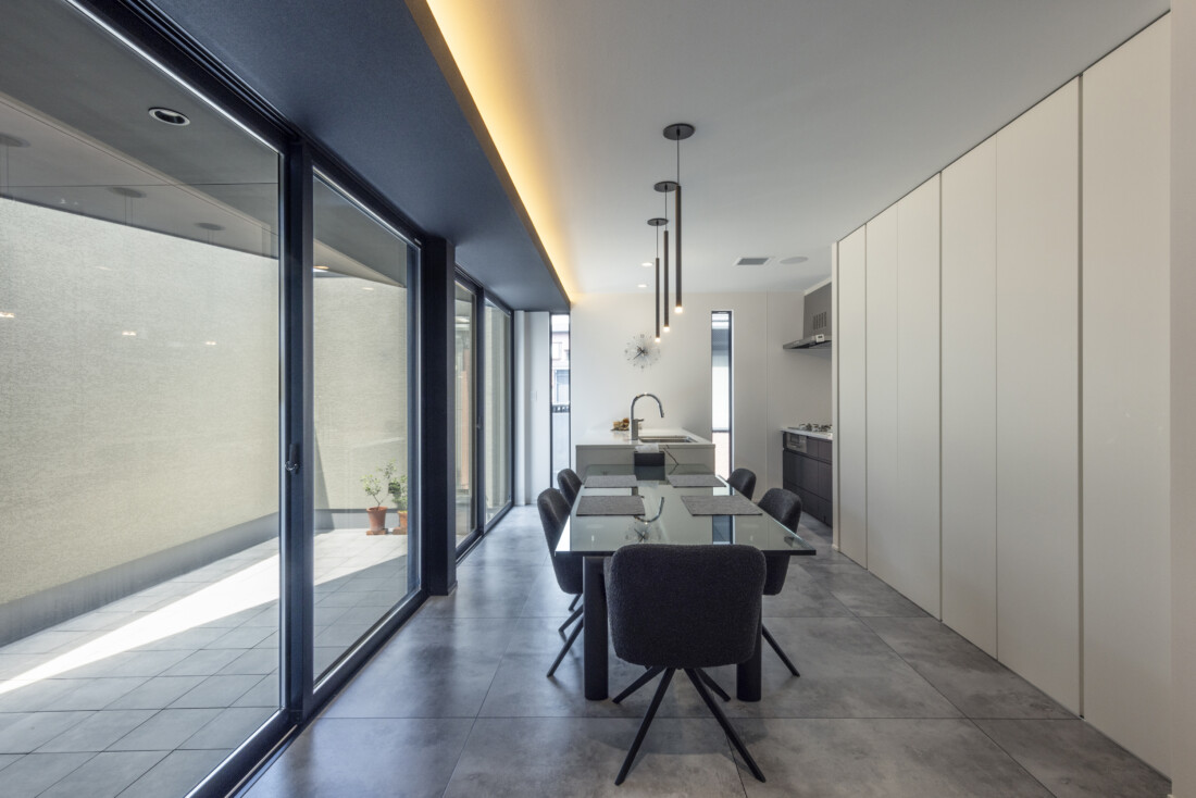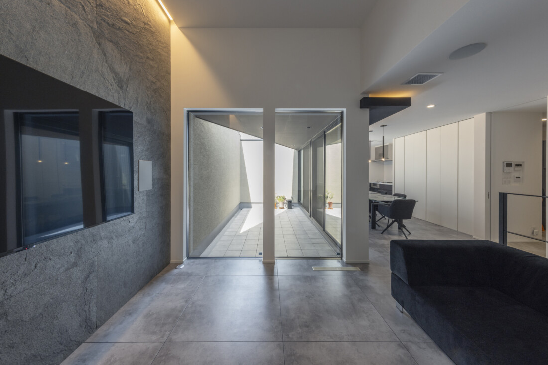 さらに、リビング横にはタイル床の中庭空間を配置。大きな掃き出し窓を介して、どの空間からも中庭を望めるため、室内外が一体となり、実際以上の広がりを感じられます。