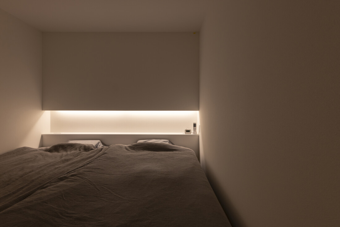 トイレや寝室、洗面空間にも間接照明を採用。装飾を加えるのではなく、光そのもので空間を演出するプランとしました。