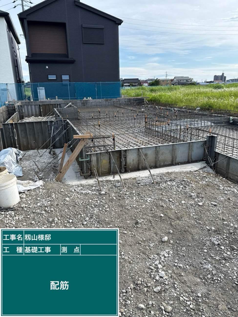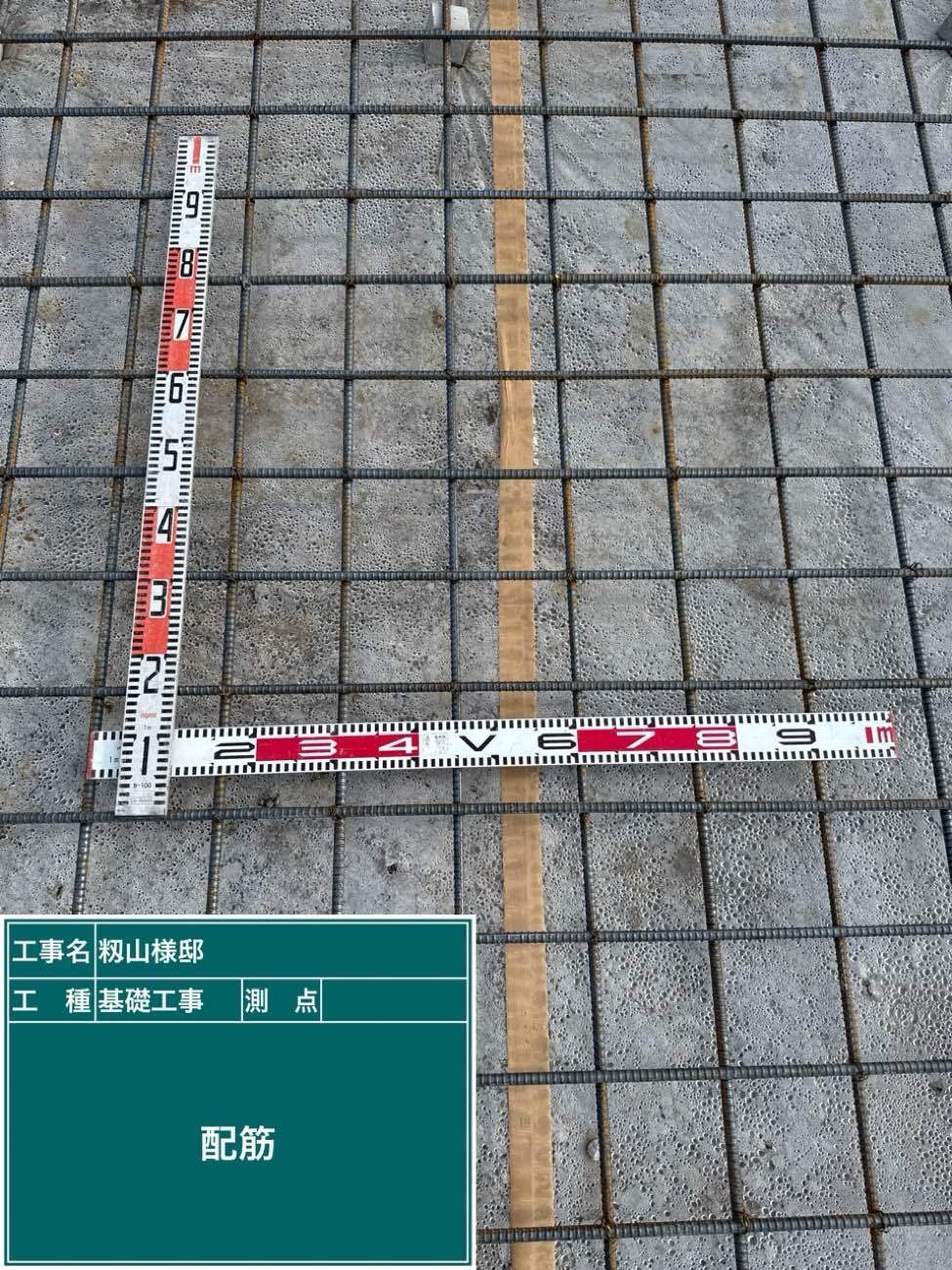 配筋工事では、正確な鉄筋位置が取れているかをしっかりと測定しながら施工が進められます。背筋は、基礎の強度や耐震性にも関わるから、とても大切な部分です。