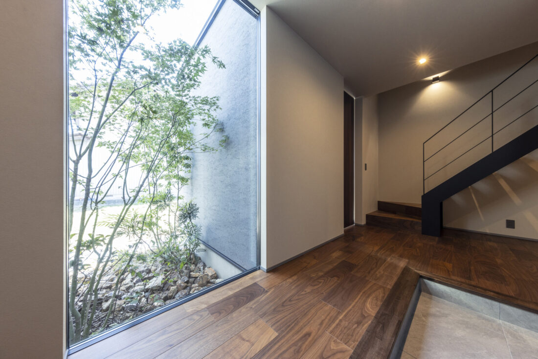 玄関ホールを広く取り、中庭のモミジを正面に。四季を迎え入れる上質なエントランス。